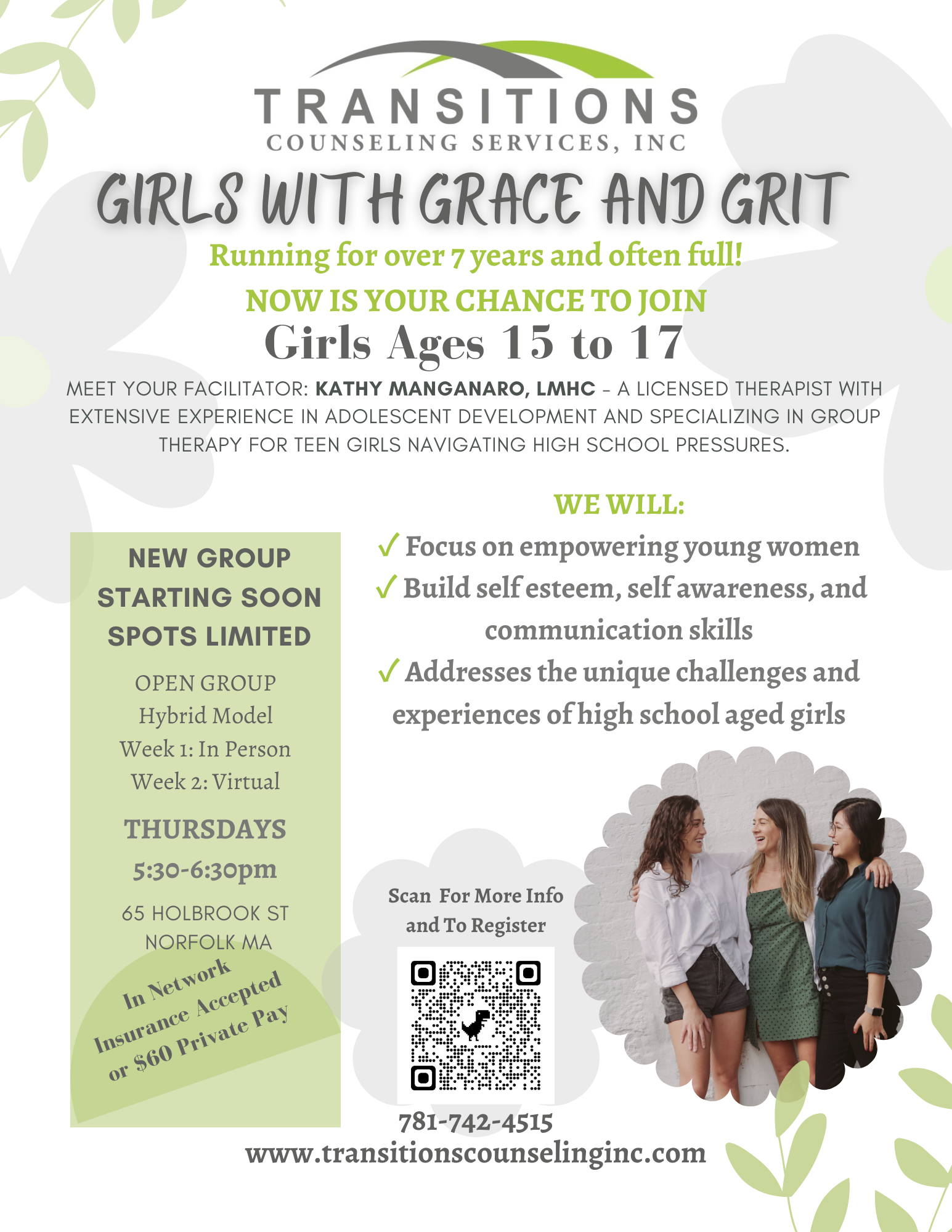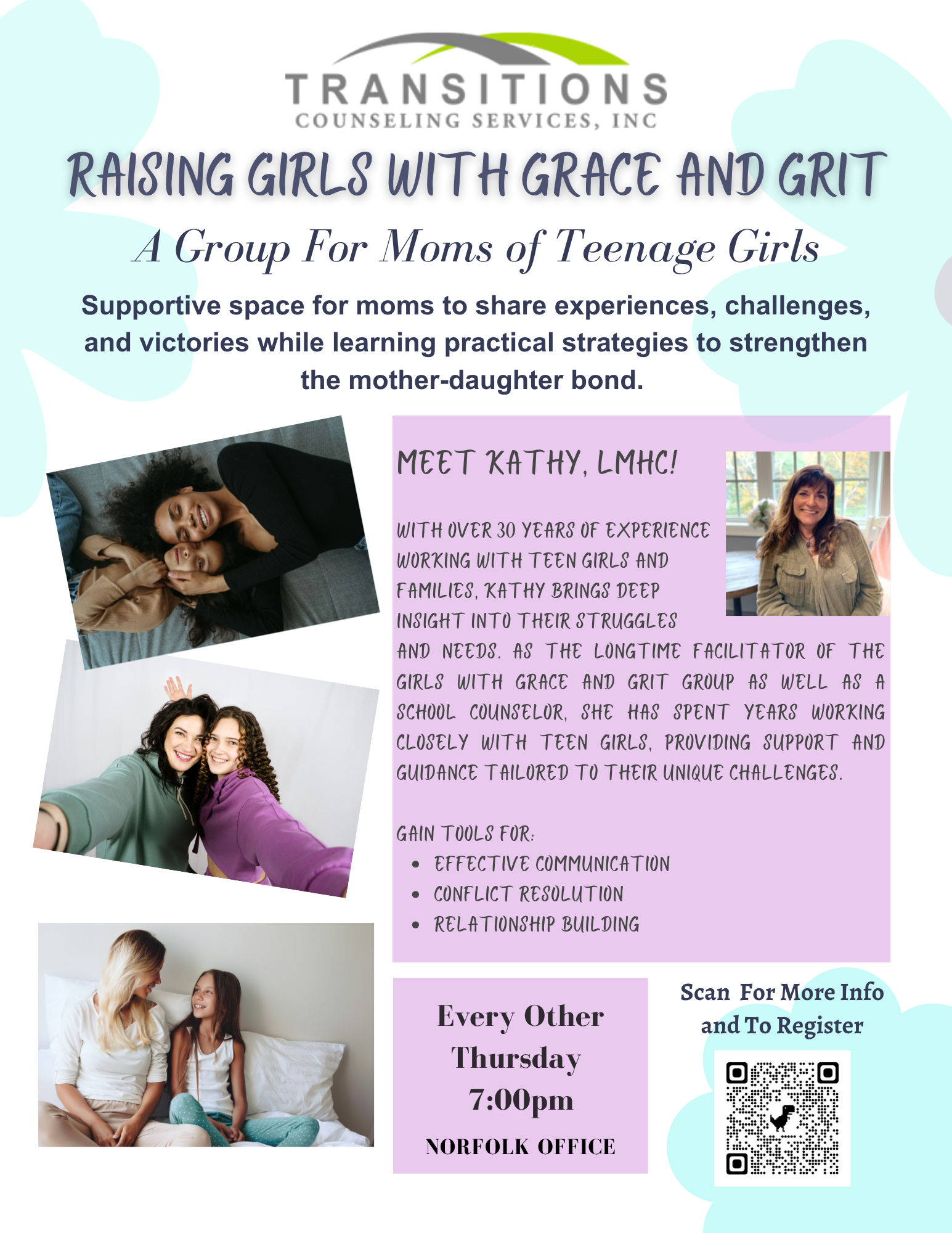 RAISING GIRLS WITH GRACE AND GRIT!: A Group for Moms of Teenage Daughters. This group provides a supportive space for moms to share experiences, challenges, and victories while learning practical strategies to strengthen the mother-daughter bond. I am a mom myself who has led the Girls with Grace and Grit Group for six years, working closely with teen girls and gaining valuable insight into their struggles and needs. Through a combination of discussion, real-life scenarios, and evidence-based strategies, moms will gain tools for effective communication, conflict resolution, and relationship-building—helping them support their daughters while fostering independence and mutual understanding. Join us and connect with other moms who understand the journey. Together, we can navigate the challenges of raising strong, resilient daughters with both grace and grit!